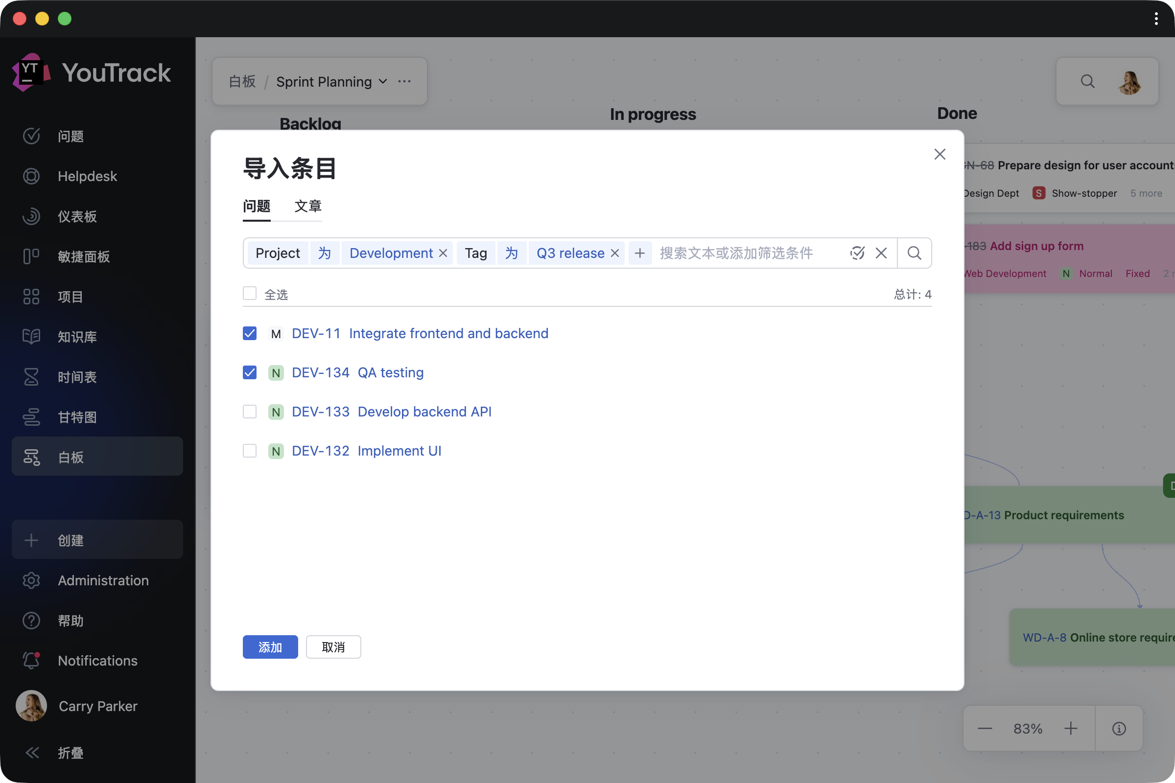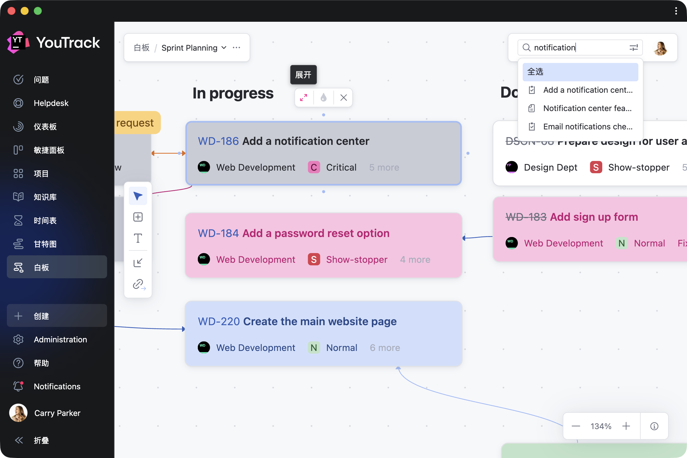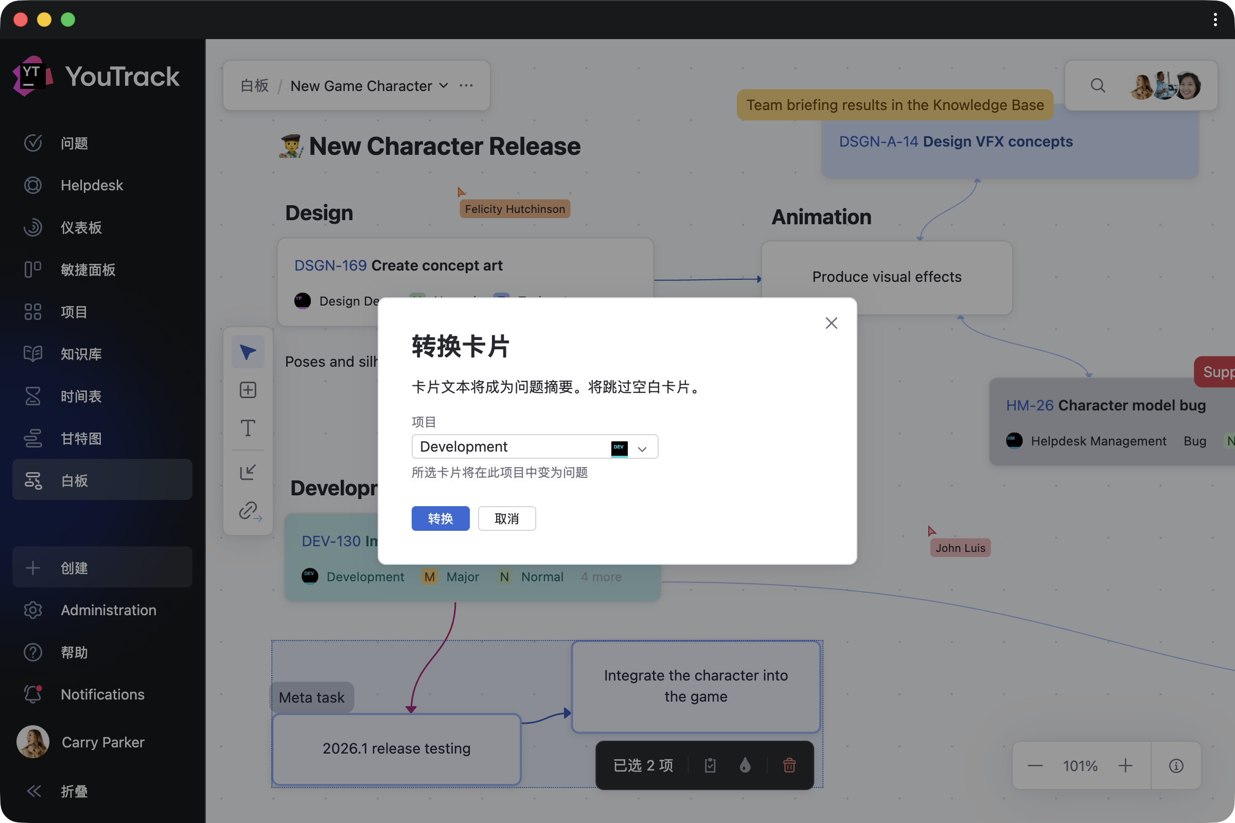 规划往往始于创意,而非结构化任务。项目经理可以规划团队路线图、调整现有工作结构,或直观呈现新项目。由于卡片会转换为 YouTrack 任务和文章,您的团队可以继续处理项目,无需中断。