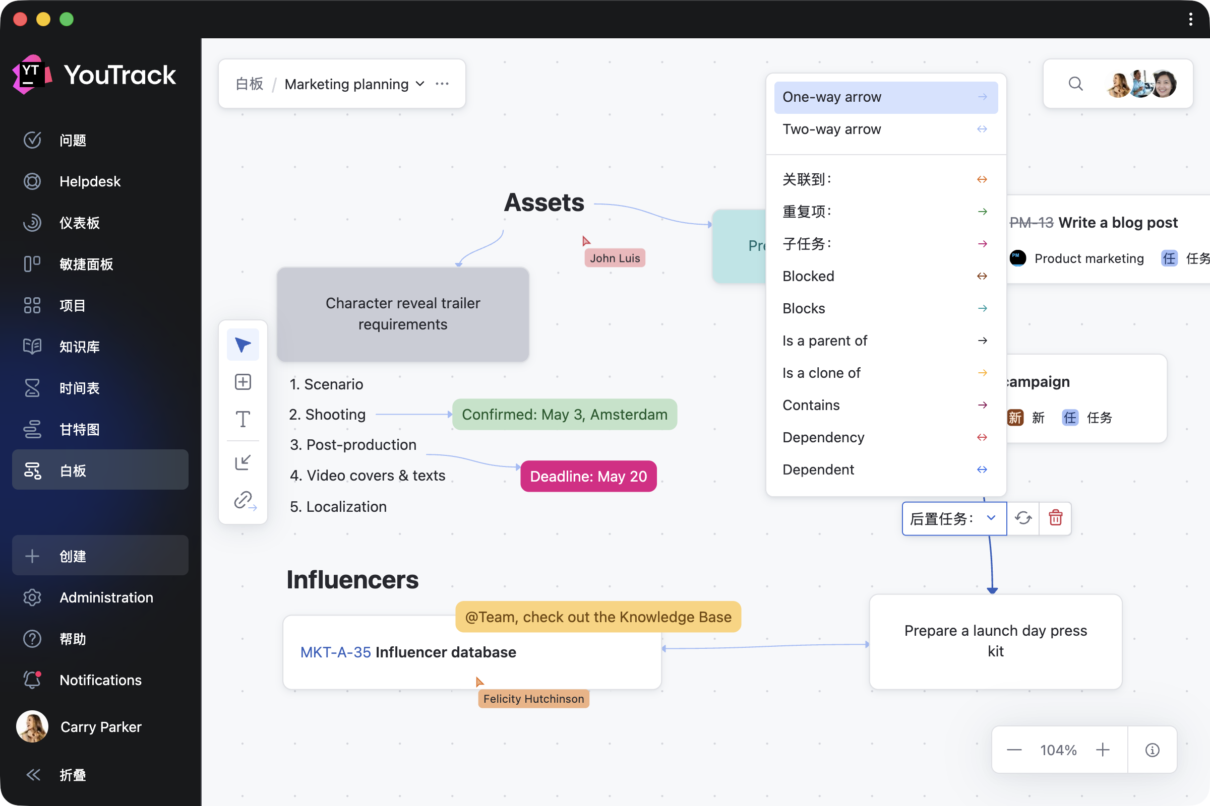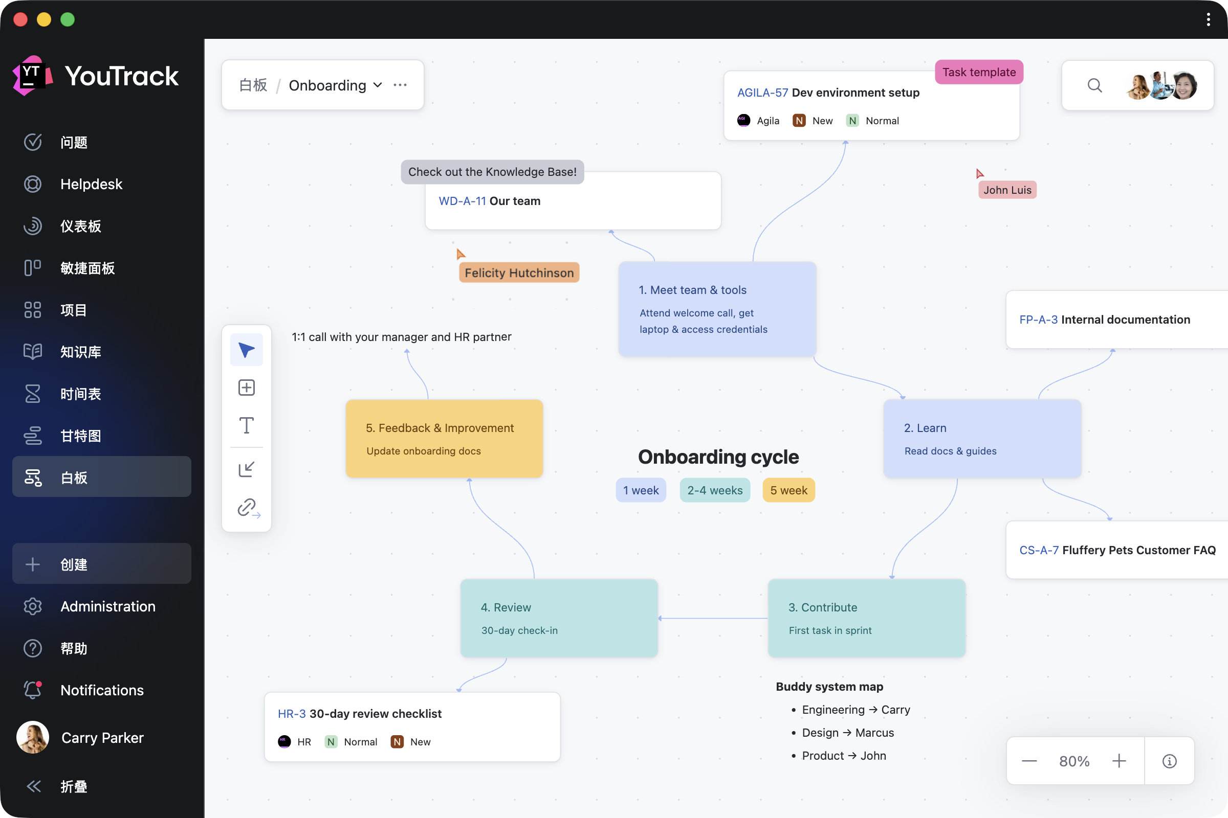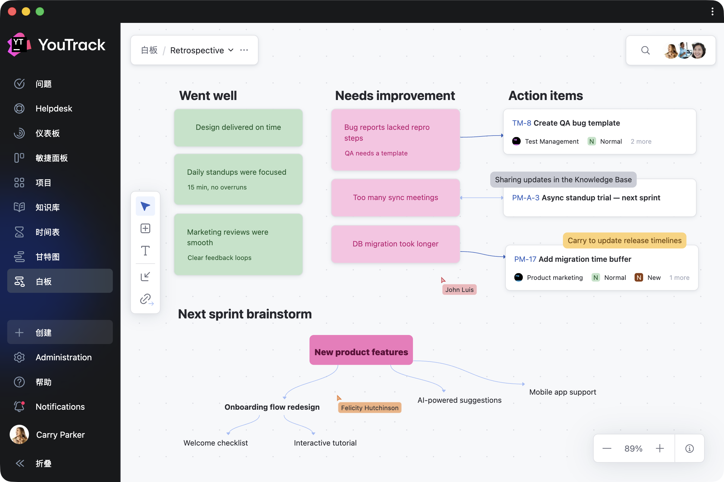 我们很高兴地推出白板 – 在这种全新的灵活空间中,您可以在处理项目时直观呈现项目。白板扩展了 YouTrack 的内置功能,并可供所有用户和支持人员使用。