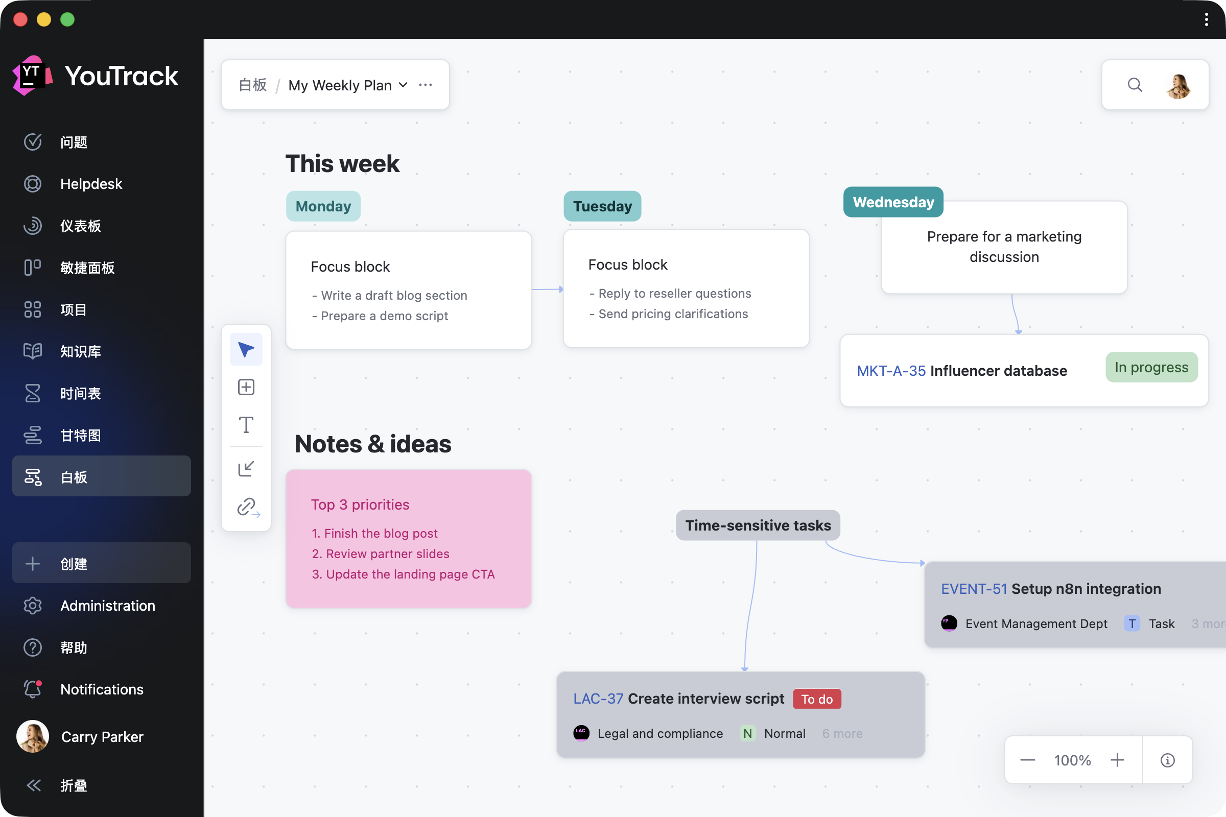 YouTrack 2026.1 引入白板,团队可以利用这种全新的方式进行规划、头脑风暴和协作。关联当前项目以获取更全面的概览并高效梳理工作,或在准备就绪时添加笔记并将其转化为任务和文章。项目经理和团队可以利用白板从零开始规划、协同处理现有项目,并确保所有活动均在 YouTrack 中关联到您的工作。