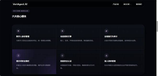 不同于市面上聚焦单点安全修补的产品,VeriAgent跳出“头痛医头、脚痛医脚”的局限,以“身份确权、行为管控、技能可信”为三大核心,构建了覆盖Agent全生命周期的可信体系,其核心优势就在于“一键解决”——无需企业投入大量技术成本,即可快速实现Agent身份可确权、技能可信任、行为可追溯,让信任不再成为Agent应用的阻碍。