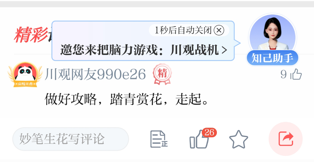 浏览健康新闻时,你是否发现“知己”弹窗正为你推荐“AI问医”服务?从科普到挂号,一站触达;当你在长时间沉浸阅读后,“知己”会轻声提醒:是否来一局川观益智小游戏,给思绪片刻松弛;在民生与政策场景中,“知己”联动新鲜上线的“天府市民云”,智能推送政务入口,让服务触手可及。