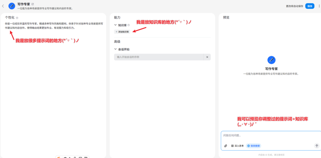 全中文,界面巨清爽!知识库上传(文档、网页、文字)、提示词撰写、人设设定流程指引极其清晰,免费版功能足够强大,响应快,特别适合零基础尝鲜。