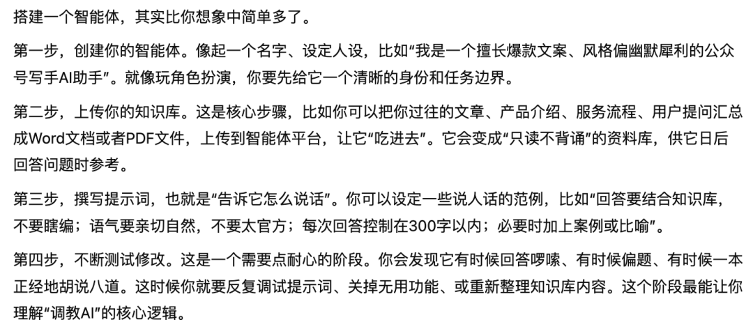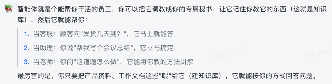 比如,你可以让它当你的客服,记住你产品的常见问答;你可以让它当你的内容助理,掌握你写作的风格、你的素材库;你也可以让它当你的知识教练,帮你复盘每天的学习,甚至规划你的工作节奏。