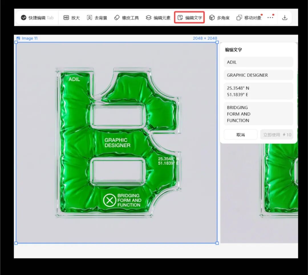 通过这里的“编辑文字”功能,快速编辑上面的文字效果。