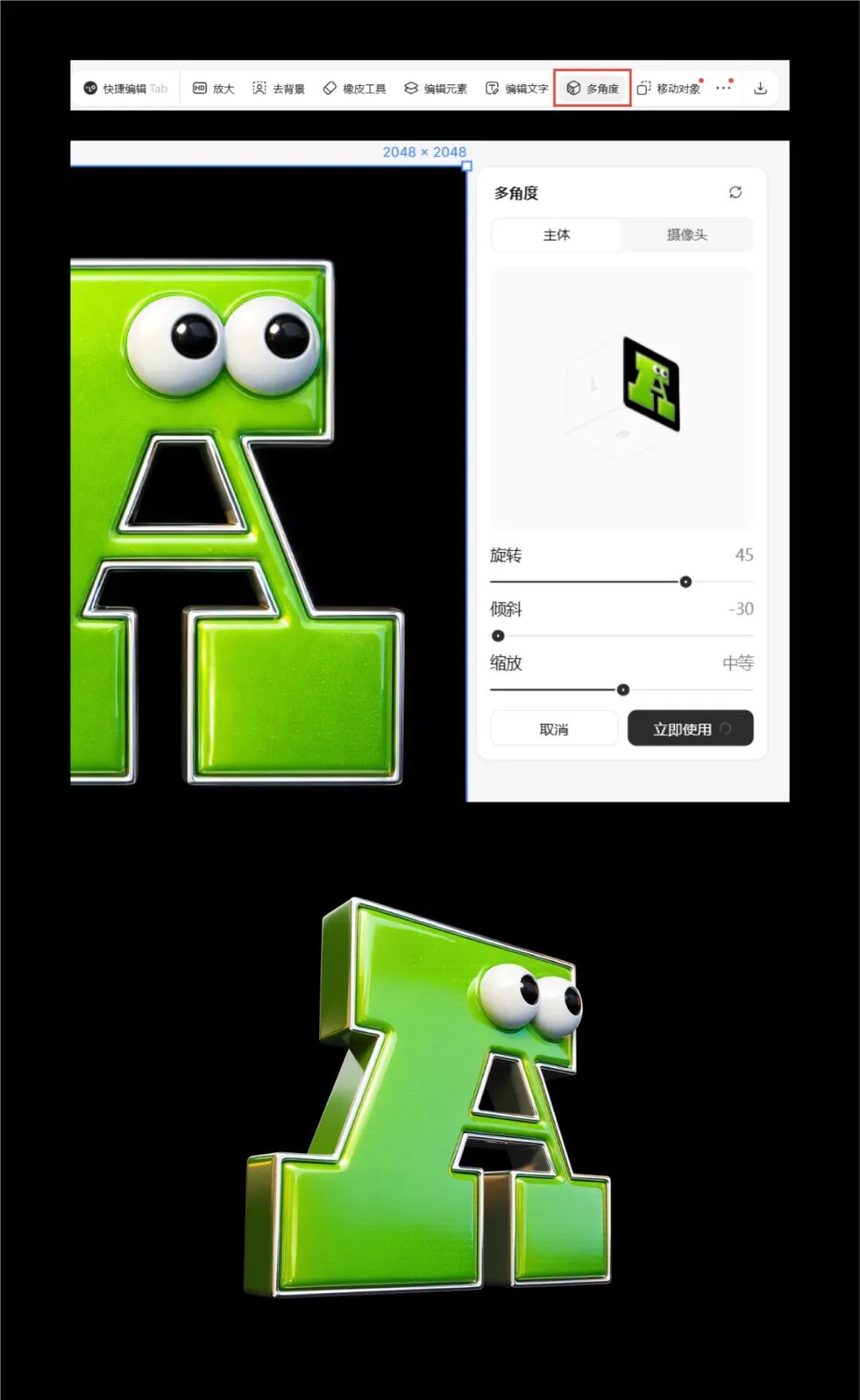 通过这里的角度修改,可以得到一些不同角度的效果,对于一些需要做ip人物动作及不同拍摄角度的同学非常有用!