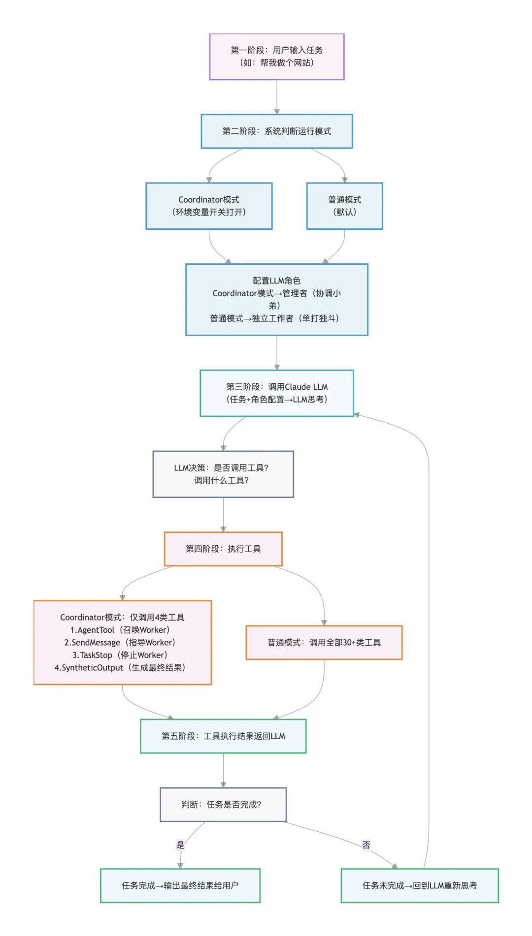 简单理解:Query Loop是拆解问题后不断的循环,直到问题解决为止,负责循环、调用LLM、执行工具。Coordinator就是一套”管理者”的大脑配置+专用工具,它让一个LLM从”自己干活”变成”指挥别人干活”。
