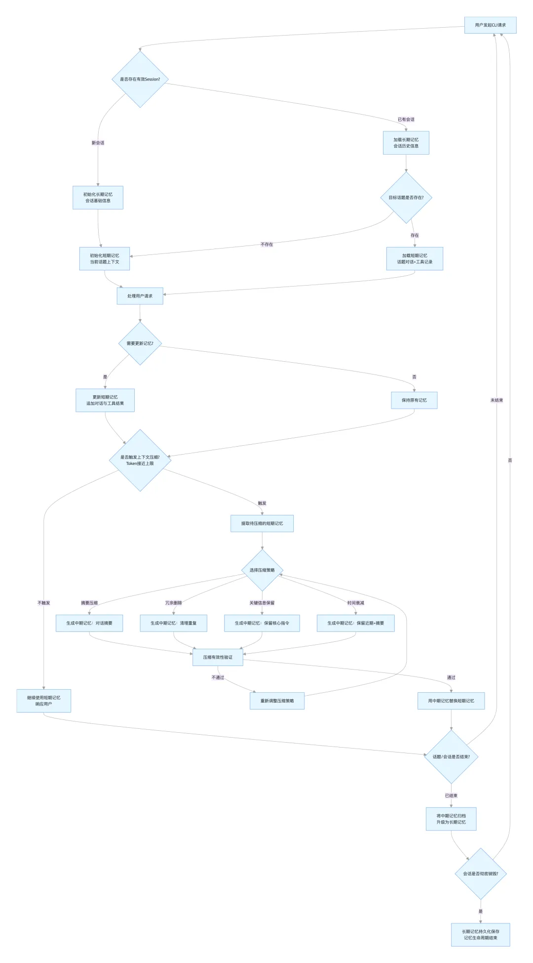 - 中期记忆更新:压缩触发时更新短期记忆超Token阈值 → 自动生成摘要,替换短期记忆的早期内容;