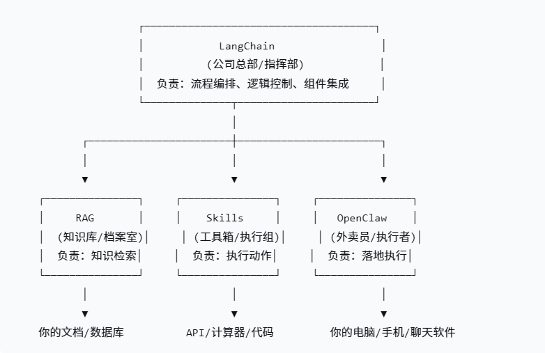 LangChain是一个Python开发框架,用于定义AI流程、集成RAG(知识库)和Skills(工具箱),控制逻辑。RAG提供信息,Skills执行任务。OpenClaw是集成RAG和Skills的完整AI助手框架,具备记忆和工具包,可直接与用户对话、执行任务。