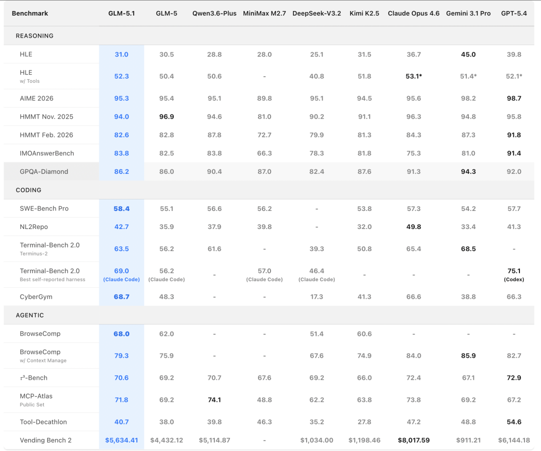- MCP-Atlas:衡量模型在多步骤工作流中调用外部工具(MCP服务器)的能力。GLM-5.1得分71.8。