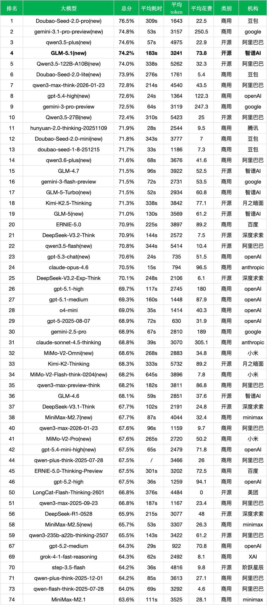- 榜单头部格局:当前榜单前四位分别为Doubao-Seed-2.0-pro(76.5%)、gemini-3.1-pro-preview(74.8%)、qwen3.5-plus(74.6%)和GLM-5.1(74.2%),头部竞争极为激烈,四者之间的差距仅为2.3个百分点。