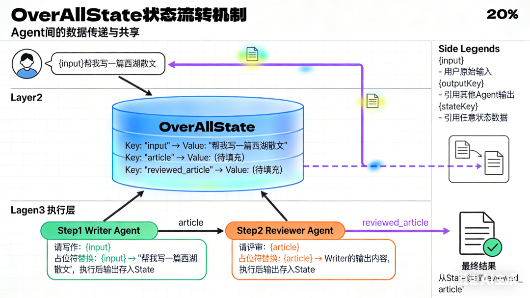 // OverAllState 自动管理,无需手动创建// Agent 通过 outputKey 将输出存入状态// 后续 Agent 通过占位符 {key} 引用状态中的值