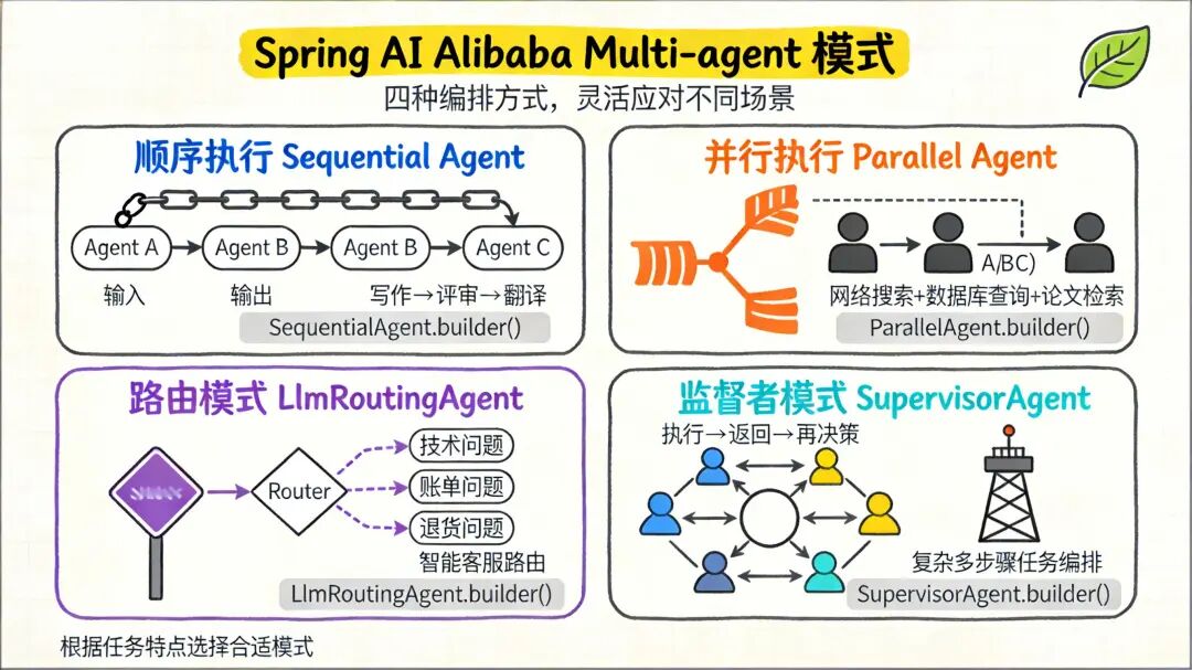 Spring AI Alibaba 支持多种 Multi-agent 模式,每种模式适用于不同的场景: