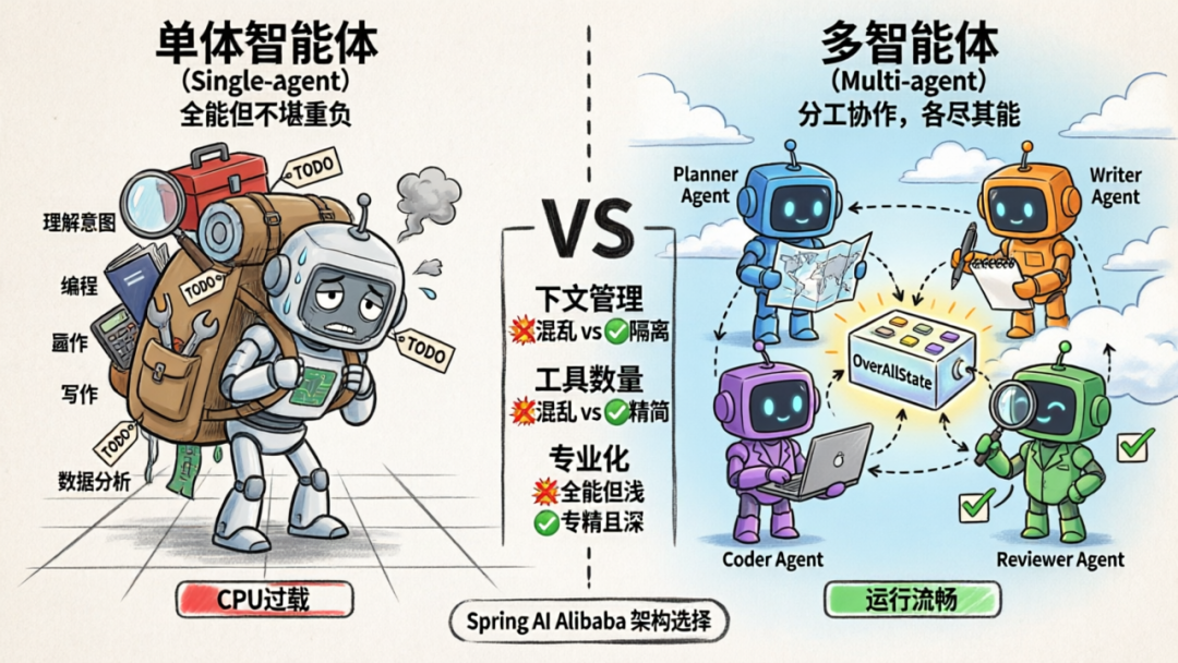 多智能体(Multi-agent)系统通过将复杂任务分解为多个协同工作的专业化 Agent,有效解决了这些问题。本文将基于 Spring AI Alibaba,深入浅出地讲解 Multi-agent 的核心概念、实现模式及**实践,并提供完整的代码示例。