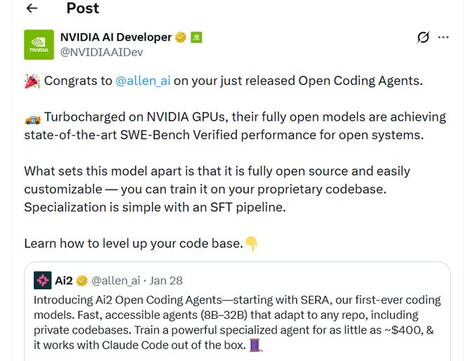 现在有了Allen AI发布的Open Coding Agents,为任何代码库构建自己的编程智能体变得异常容易,你可以使用个人代码库或所在组织的内部代码库,轻松训练一个能够用于包括代码生成、代码审查、调试、维护和代码解释等任务的智能体。