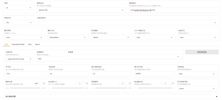 LLaMA-Factory[37]是一个专注于LLaMA系列大语言模型生态建设的开源项目,旨在通过模块化设计降低大模型训练与应用门槛。它整合了从数据预处理、模型微调(支持LoRA、QLoRA等参数高效技术)到推理部署的全流程工具,提供可视化界面与命令行接口双模式操作,支持医疗、金融等垂直领域的模型定制。项目依托社区协作持续优化模型性能,同时兼容Hugging Face生态,助力开发者快速落地大模型应用。该平台的可视化界面如图5.3所示。