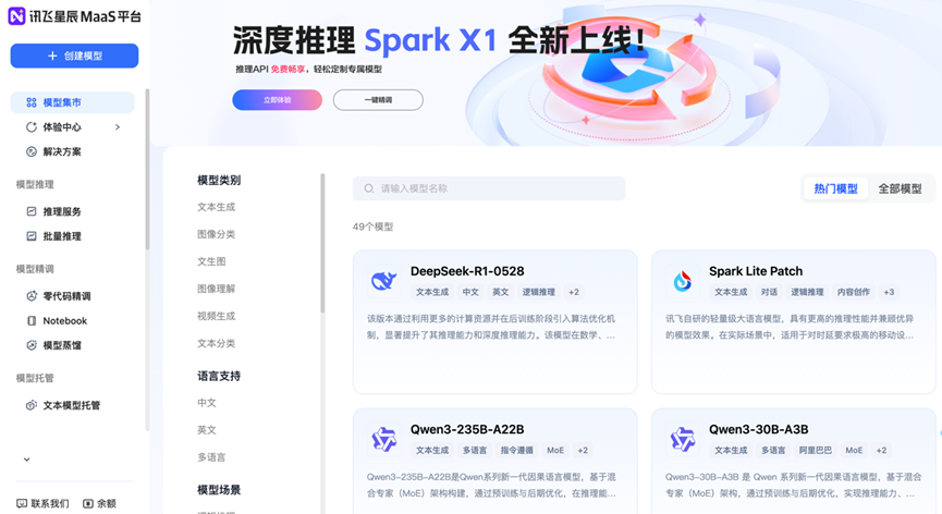 (1)丰富的模型资源集成:平台集成超过20个行业知名模型,涵盖星火系列、Llama3、SD-XL等,并且支持书生系列、Qwen2.5系列等开源模型精调,新增Spark Max、Spark Mini等自研模型。丰富的模型选择满足了从复杂推理、多模态生成到智能决策等不同领域、不同场景的业务需求,开发者可依据具体任务灵活选用合适模型。