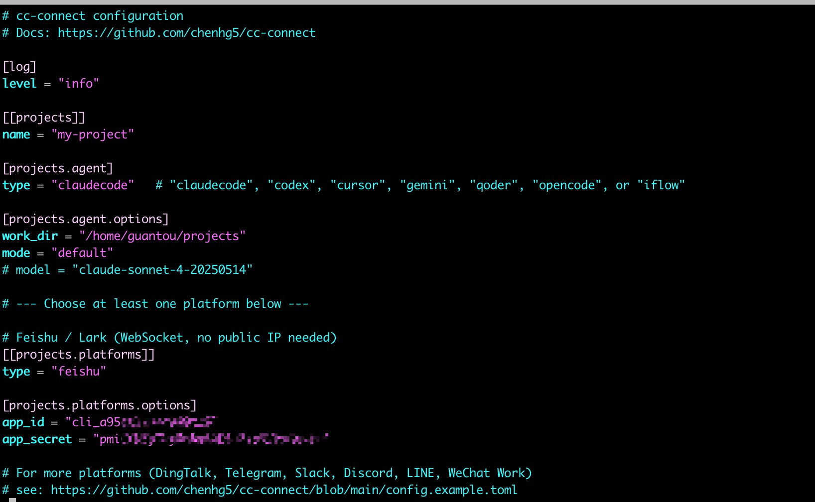 执行完命令后,你/.cc-connect 目录就会出现一个config.toml