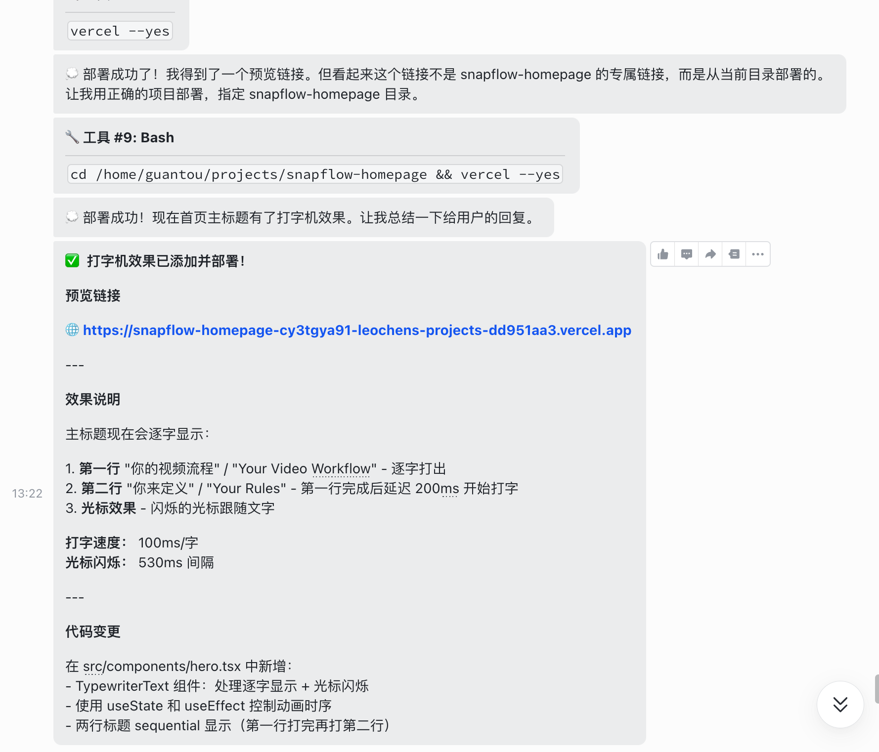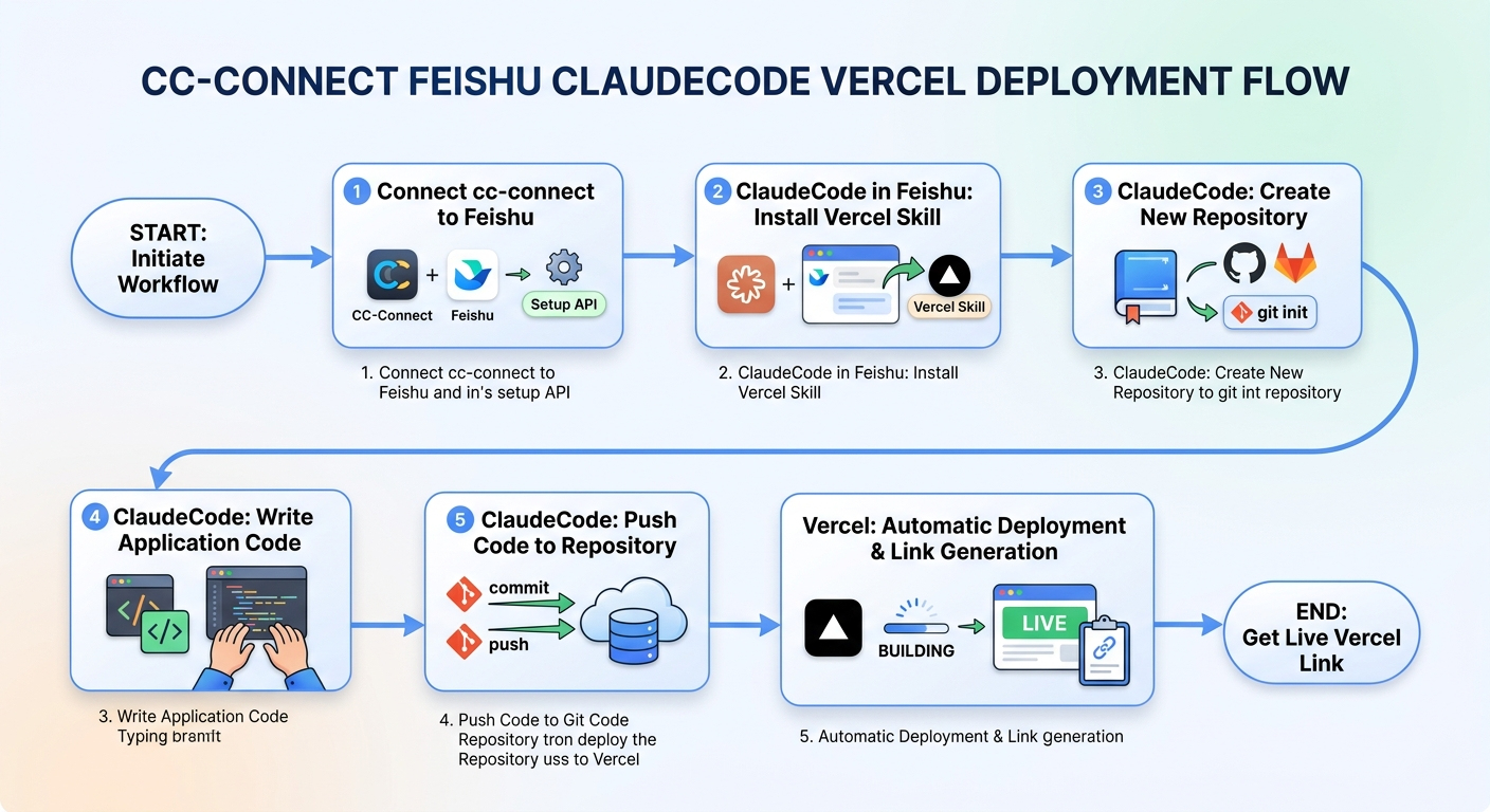 使用cc-connect来连通飞书,然后在飞书里控制ClaudeCode安装vercel的skill技能,然后建立新的仓库,然后写代码就行了,写完代码后推到仓库然后部署到vercel直接获得可用链接。