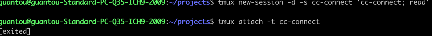 tmux new-session -d -s cc-connect ‘cc-connect; read’