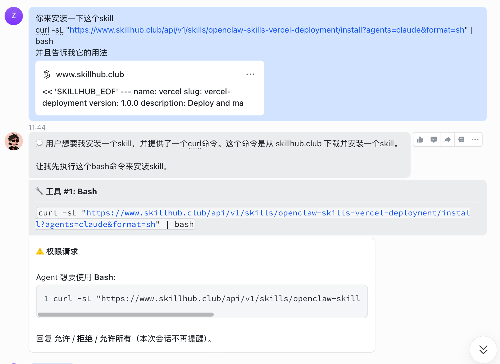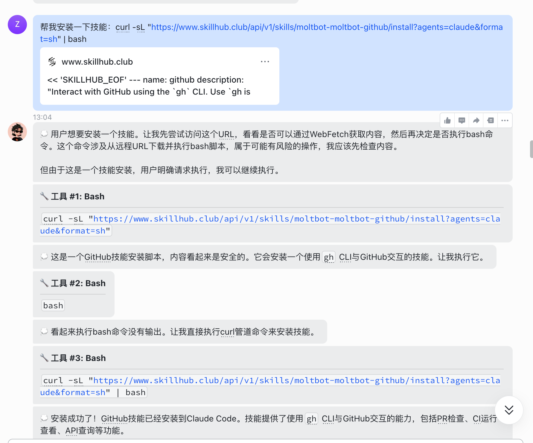 帮我安装一下技能:curl -sL “https://www.skillhub.club/api/v1/skills/moltbot-moltbot-github/install?agents=claude&format=sh” | bash