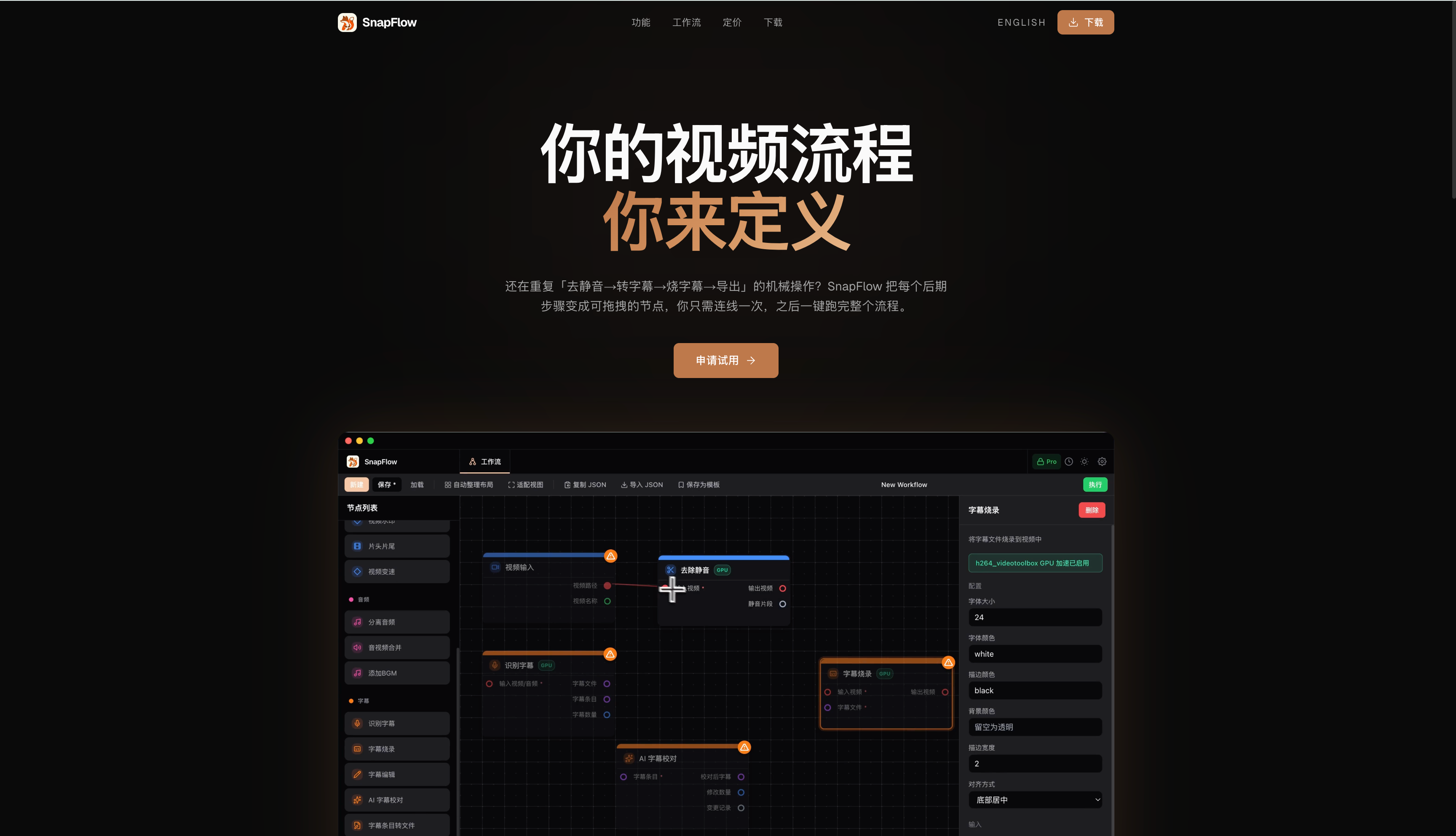 现在可以让你的ClaudeCode来编写一个小项目,比如我这里就用我自己独立开发的一个小项目SnapFlow来演示吧,它是一个可视化定制后期视频制作工作流的一个电脑端App,我基本做视频都会用它,现在正在免费内测,有兴趣的朋友可以试试,我为他编写了一个官网(https://snapflow.guantou.site/),长这样,这个官网的话目前就是部署到Vercel的。