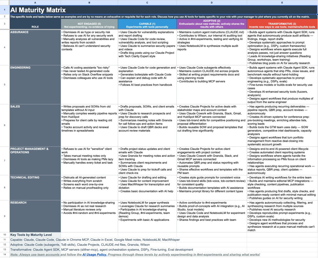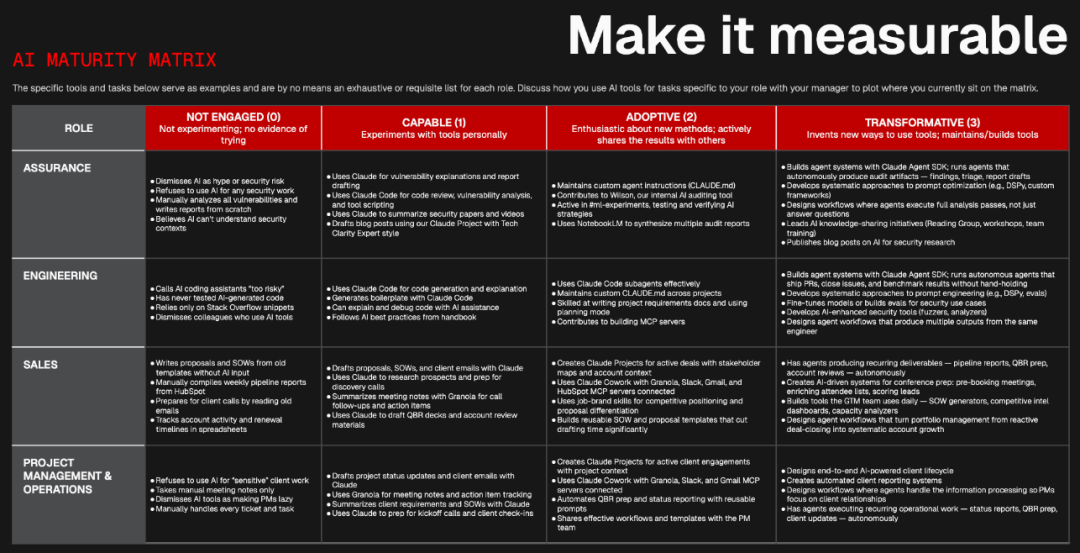 针对自我增强偏见,他们做了AI成熟度矩阵,把AI能力变成了和「会用Git」「会写测试用例」一样的专业能力,有清晰的等级、明确的上升路径,把模糊的“AI有没有用”,变成了看得见的成长阶梯。