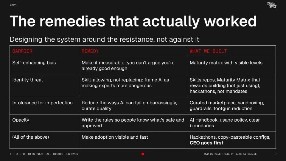 有意思的是,Trail of Bits的转型,不是硬推工具,而是先解决人的抵触问题。