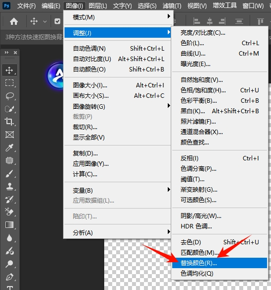 ② 打开替换颜色命令:点击顶部菜单栏「图像」→「调整」→「替换颜色」,弹出替换颜色对话框,界面直观,便于操作。