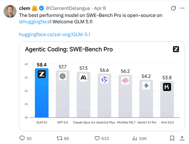 在智谱开源发布GLM-5.1 模型12小时之后,智谱在X上的官方推文有370万阅读。HuggingFace的CEO Clement Delangue公开转发祝贺:“SWE-BenchPro上表现最好的模型现在在HuggingFace上开源了。”