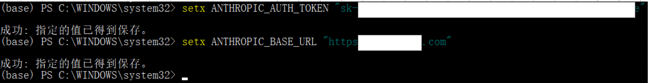 setx ANTHROPIC_AUTH_TOKEN "粘贴令牌key" setx ANTHROPIC_BASE_URL "你买的api的网站"