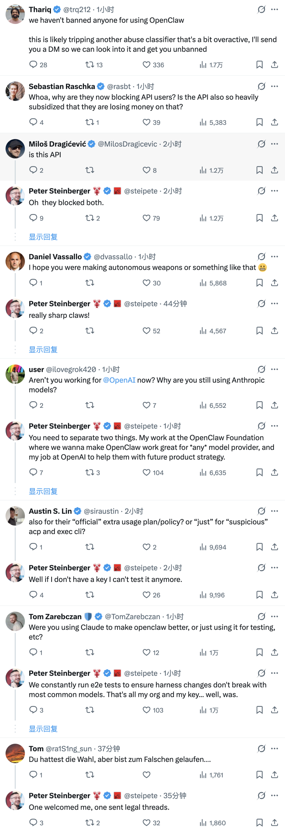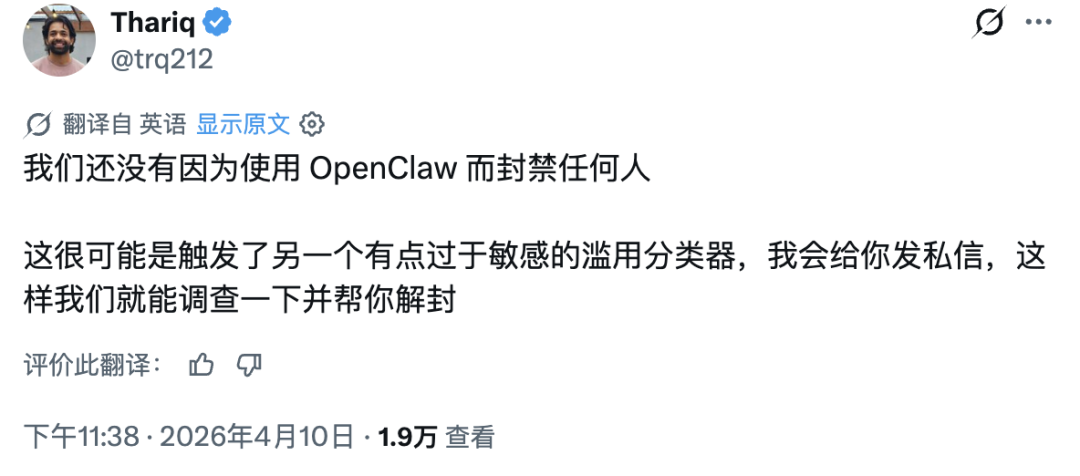 根据同一讨论串中展示的回复,Anthropic 员工 Thariq 表示,公司“没有因为使用 OpenClaw 而封禁任何人”,并称这更可能是另一个滥用识别分类器“有些过度积极”后造成的误判,后续会通过私信进一步核查。