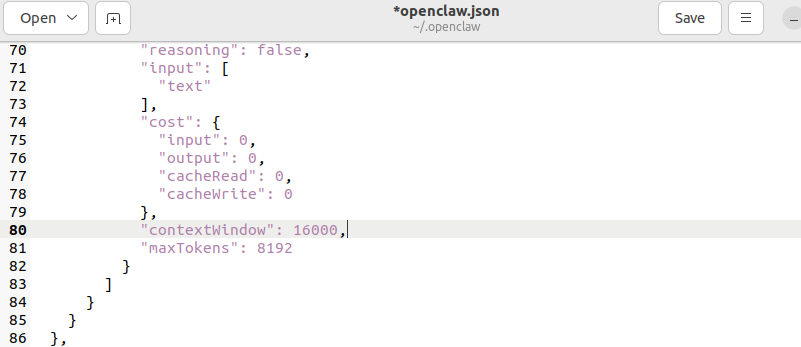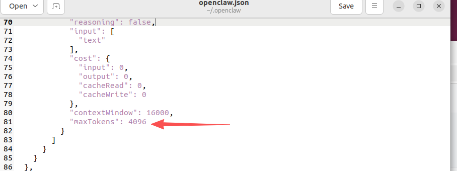 打开~/.openclaw 目录下的openclaw.json,修改对应的maxTokens,如下图: