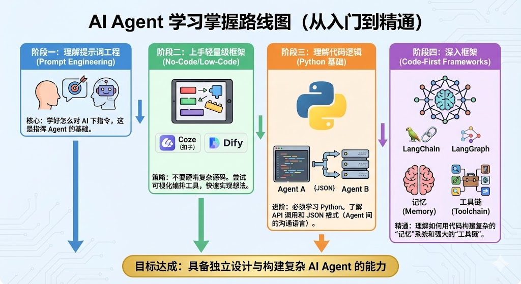 本文深入浅出地解释了AI Agent的概念和重要性,将AI Agent比作“全能的超级实习生”,拥有LLM的大脑进行决策,同时具备执行任务的能力。文章详细介绍了AI Agent的组成部分,包括大脑(LLM)、规划、记忆和工具,并通过实际场景演示了Agent的工作原理。此外,还为初学者提供了学习路径建议,从提示词工程到轻量级框架,再到代码逻辑和深入框架,帮助读者逐步掌握AI Agent技术。