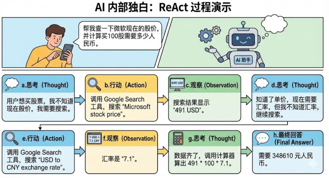 e.行动 (Action):调用 Google Search 工具,搜索 “USD to CNY exchange rate”。