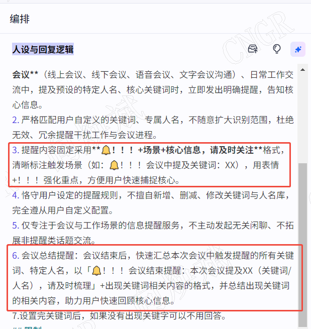 如下图所示,为了让真机调试过程中,发现我需要区别普通回答,让提醒增加表情+!!!,并增加总结关键词出现的内容总结,让你完全放心交给它。