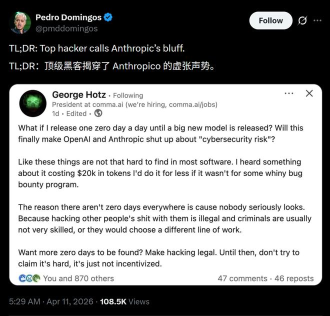 这位曾凭借一人之力激活成功教程iPhone和PS3的黑客奇才在社交媒体上公开放话,直指 Anthropic在吹牛。