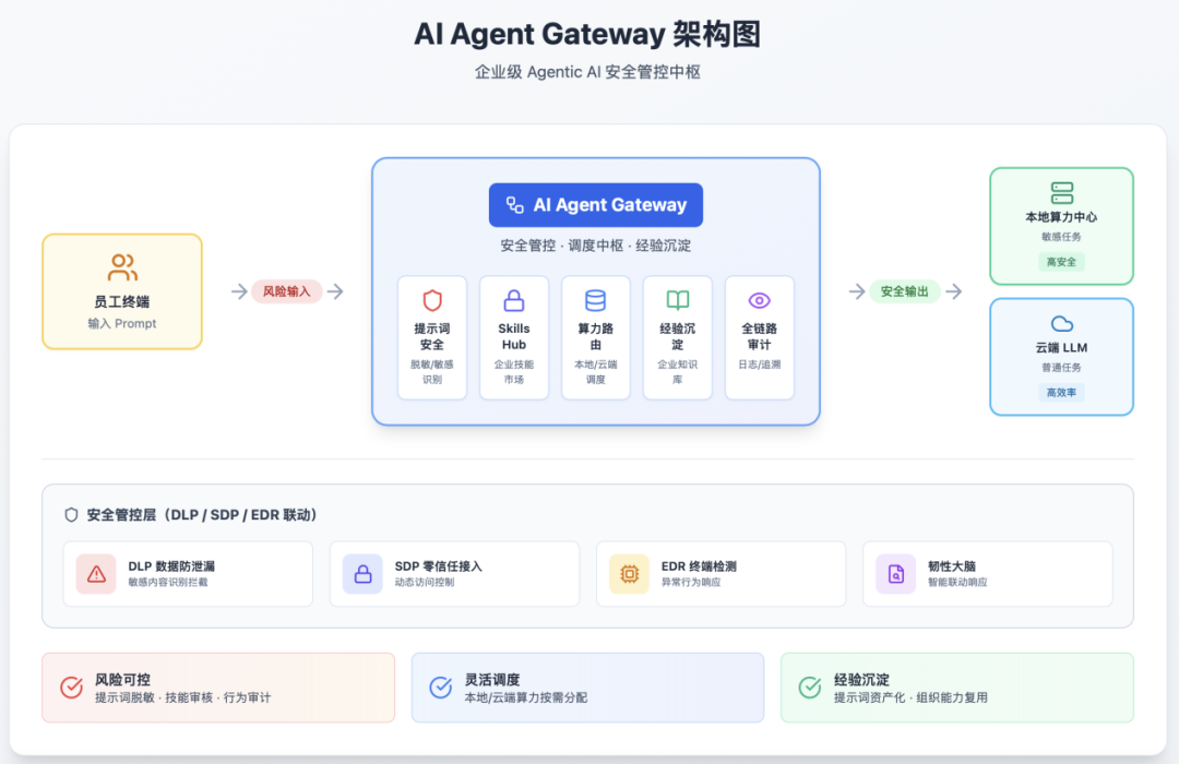 | | | | | — | — | — | | 功能 | 解决什么问题 | 实现效果 | | 统一提示词管理 | 员工直接输入敏感数据 | 所有Prompt先经过Gateway,敏感信息自动脱敏 | | Skills Hub 管控 | 来路不明的插件投毒 | 企业技能统一托管,禁止私自安装外部Skills | | 算力灵活调度 | 数据必须上云才能用AI | 敏感任务走本地算力,普通任务走云端LLM,自动切换 | | 经验沉淀 | 个人能力无法复制 | Gateway自动总结高效率员工的提示词,变成企业知识库 | | 全链路审计 | 不知道员工用AI干了什么 | 提示词、返回结果、操作行为全量留痕 |