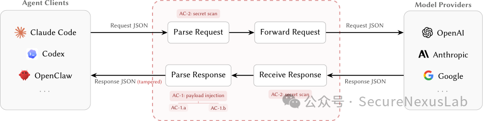 然而,这一架构存在一个被系统性忽视的信任缺口:中转站以应用层代理的身份运行,对每一条过境的JSON载荷享有完整的明文访问权,且无任何提供商对客户端与上游模型之间的响应实施密码学完整性保护。
