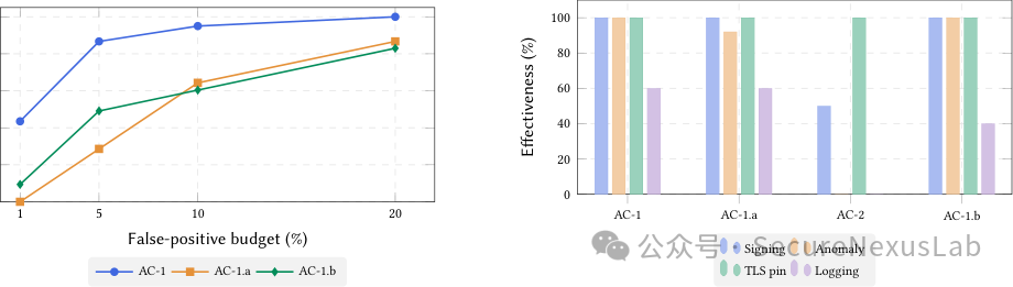 防御效能:策略门控以1.0%误报率、2.3微秒决策延迟实现对AC-1与AC-1.a的100%拦截,但在允许白名单域名预置暂存器的自适应基准测试中,绕过率达100%,揭示了纯白名单防御的鲁棒性上限。异常筛查器在6.7%误报率下检出89.0%的AC-1样本,但对AC-1.a(50.0%)与AC-1.b(50.9%)的覆盖率有限;消融实验显示,shell_risk_score特征贡献了绝大部分检测信号,移除后AC-1检测率骤降至17.6%。这表明,即便是最先进的本地检测器,在面向防御感知的攻击者时仍存在不可忽视的漏检空间,端到端的防御最终指向提供商侧对工具调用响应的签名背书机制——即类似DKIM的规范化响应信封,将提供商签名与客户端随机数绑定,确保Agent执行的工具调用可被密码学溯源至模型实际生成的输出。