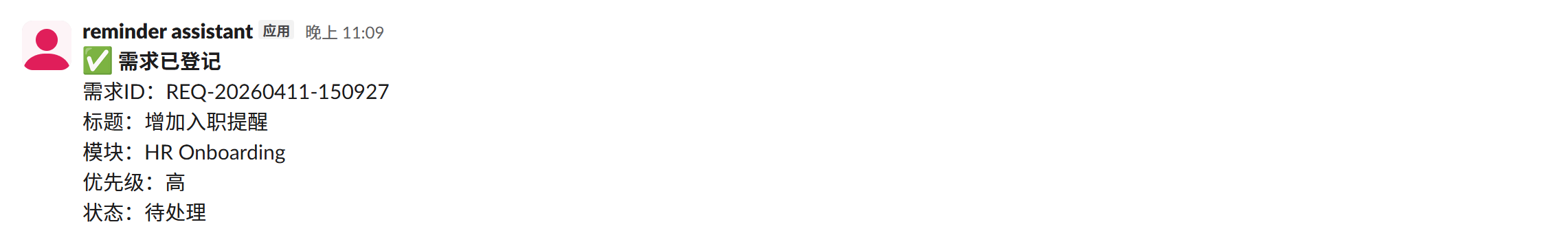 demand_requests表里新增一行- slack 频道收到一条确认消息,如下图所示(slack 频道中所示)。