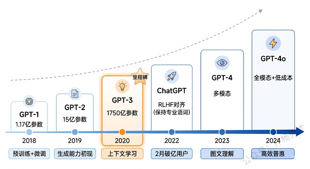 GPT-4o / GPT-4o mini(2024年)——"o"代表"omni"(全能),进一步增强了多模态能力,支持文本、图像、音频的统一理解和生成,同时大幅降低了使用成本和延迟。