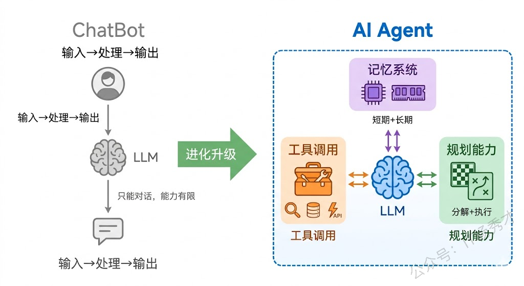 简单来说,大模型是 Agent 的"大脑",而 Agent 在大脑的基础上,给它装上了"手"(工具调用)、"记忆"(短期/长期记忆)和"规划能力"(任务分解与执行策略)。