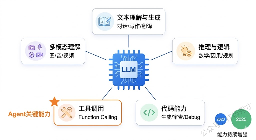 了解了大模型的历史和格局之后,我们来看看大模型到底能做什么。对于 Agent 开发者来说,理解模型的核心能力非常关键,因为 Agent 的能力上限本质上取决于底层模型的能力。