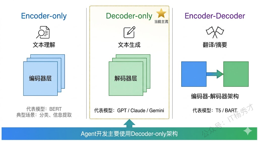 目前主流的大语言模型基本都采用 Decoder-only 架构,因为它在文本生成任务上表现最好,而 Agent 应用恰恰是以生成为核心的。