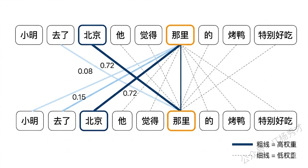 用一个通俗的例子来解释:假设你在读一段话——"小明去了北京,他觉得那里的烤鸭特别好吃"。当你读到"那里"的时候,你的大脑会自动把注意力回溯到"北京",而不是"小明"。这就是注意力机制做的事情——让模型在处理每个词的时候,能够"关注"到句子中最相关的其他词。