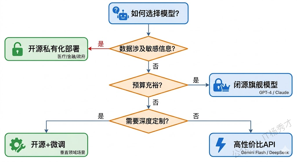 对于 Agent 开发者来说,不需要非此即彼。实际项目中,很多团队采用的是 混合策略:在开发调试阶段,用闭源模型(如 Gemini、GPT-4)快速验证想法,因为效果好、接入快;到了生产部署阶段,再根据实际情况做选择——如果数据涉及隐私,就用开源模型做私有化部署;如果对效果要求极高,就继续用闭源模型的 API;如果追求性价比,DeepSeek 和 Gemini Flash 这类方案会是不错的选择。