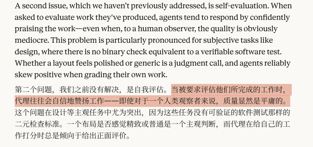 即使在人类看来,质量明显不行。这个问题在主观任务上(比如前端设计,页面到底好不好看)尤其严重,因为没有二元的对错标准。但即使在有客观标准的任务上,Agent 的自我判断也会出问题。
