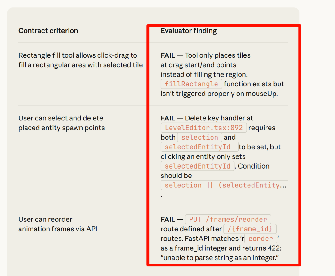 但 evaluator 也不是天生就靠谱。开箱即用的 Claude 是一个很差的 QA Agent。 早期的 evaluator 会发现问题,然后说服自己这不是大问题,接着就批准了。它也倾向于做表面测试,不去探边界。他们花了好几轮来校准 evaluator 的判断标准,让它的严苛程度符合人类预期。