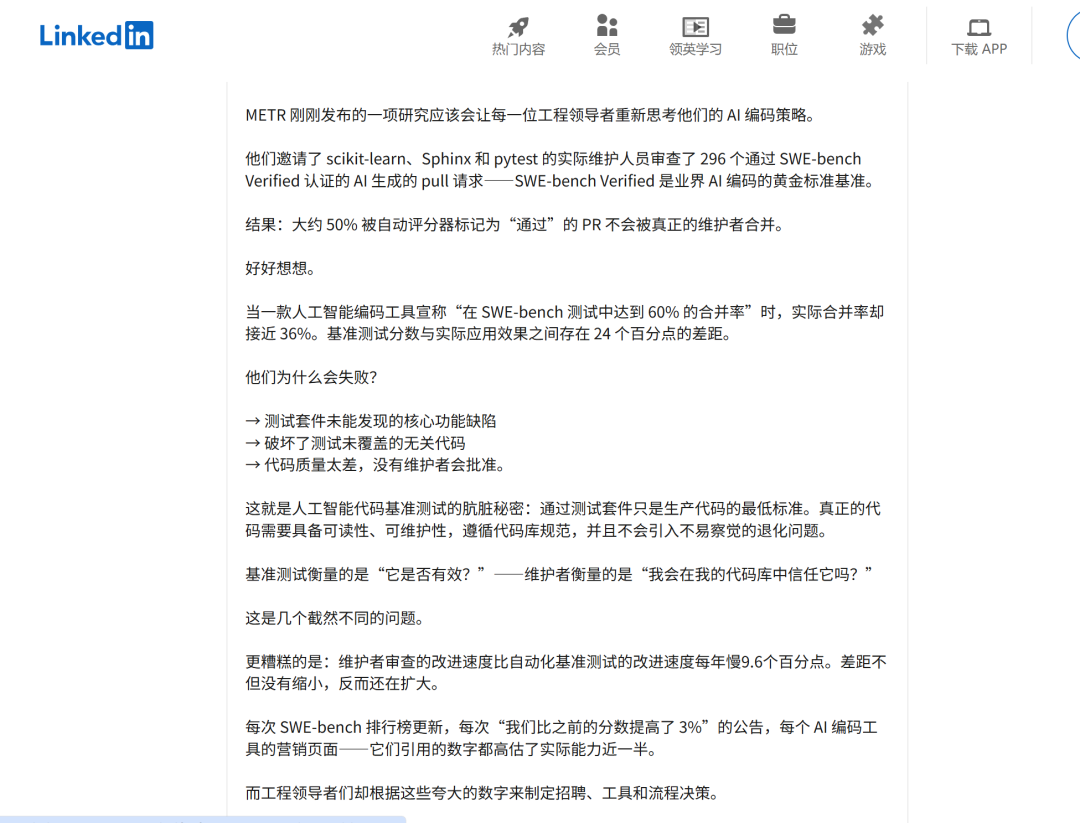他们找了 scikit-learn、Sphinx、pytest 三个项目的 4 位活跃维护者,审查了 296 个 AI 生成的 PR。结果:维护者的合并率大约只有自动化评分通过率的一半。