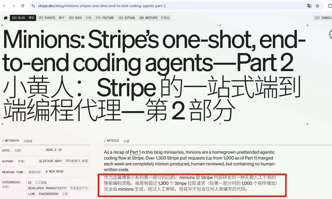 Stripe 的内部系统「Minions」,每周合并 1300 多个 PR,全部由无人值守的 Agent 完成。